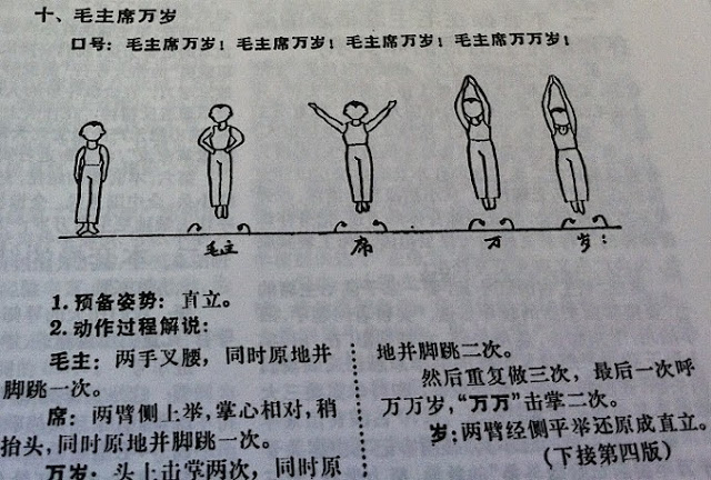 得跟着“神圣”。比方上面最后那个图,太祖万岁与跳的高矮好像有联系。如果做操的孩子赶上是个胖敦,类似毛将军那种,跳矮了,不是折太祖的寿吗?所以动作