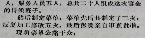 上面那个菜单是彭在1965年宴请回大陆定居的原中华民国代总统李宗仁先生所用。不光菜单,这篇载在“首都财贸”小报上的文章,还把宴会的其它奢华细节抖落出来: